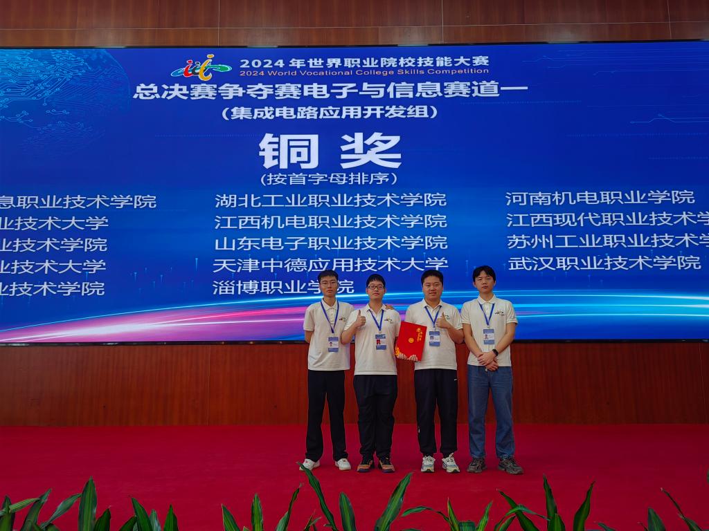 近日,2024年世界职业院校技能大赛总决赛争夺赛“集成电路应用开发”赛项在深圳信息职业技术学院举办,全国共有56支高职院校代表队参赛。新葡萄学生芦瀚、谭乙钇、王博、吴建军四位同学组成的参赛团队,在激烈的比拼中荣获全国铜奖。