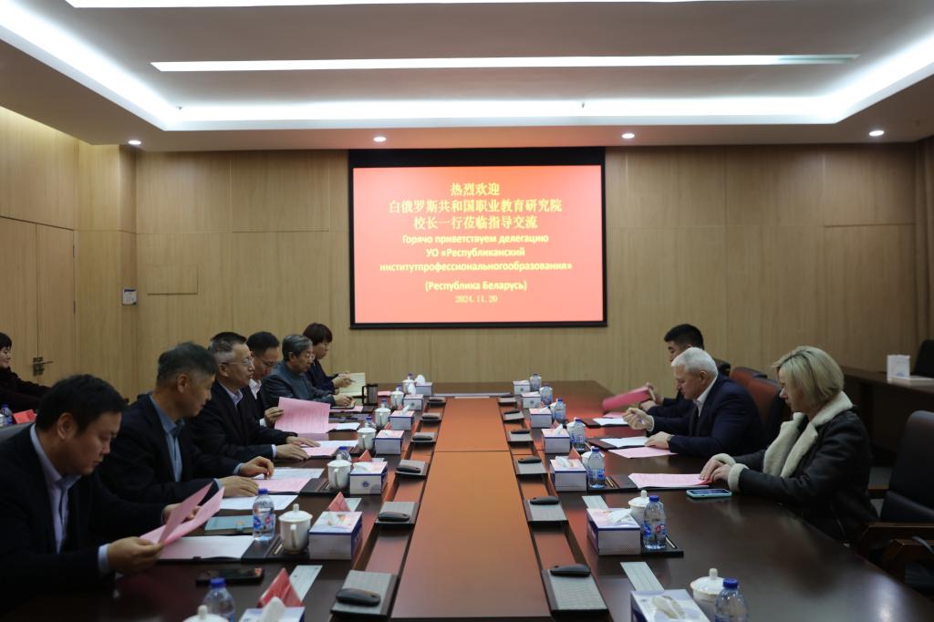 2024 年 11 月 20 日,白俄罗斯共和国职业教育研究院校长戈卢博夫斯基·瓦莱里·尼古拉耶维奇、国际合作中心主任克列尼娜·奥尔加·瓦列里耶夫娜、白俄罗斯国立大学中国信息技术中心主任王耀田教授一行三人来访新葡萄。新葡萄党委书记张继东亲切会见了代表团,向代表团介绍了新葡萄的发展历程和现状,并听取了尼古拉耶维奇关于白俄罗斯职业教育的情况。