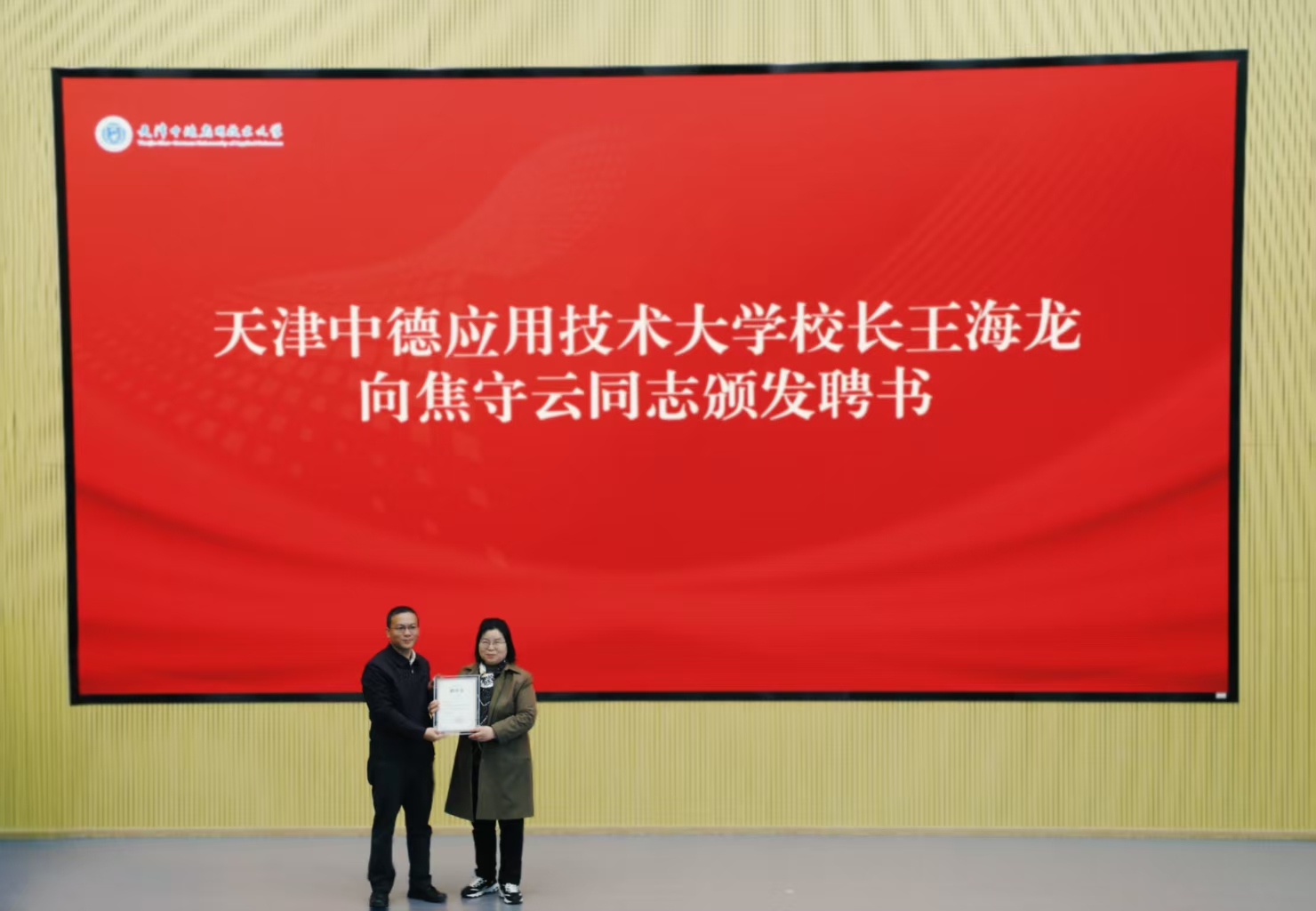 随后,校长王海龙向焦守云女士颁发了“关心下一代工作委员会特聘教授”聘书。学校与北京裕禄讲堂签订共建协议。市教育两委和学校领导与焦守云女士共同为“‘焦裕禄精神’大思政课教育基地”和“天津市影视思政教育中心‘大思政课’实践研学基地”揭牌。