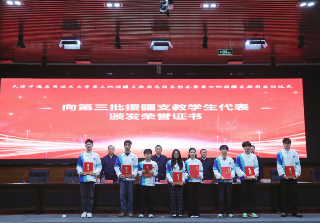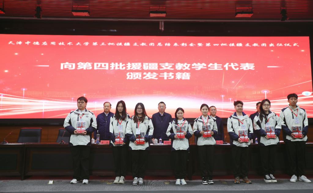学校领导为第三批援疆支教学生代表颁发荣誉证书,并向第四批援疆支教团学生代表赠送书籍《习近平的七年知青岁月》《习近平在正定》。第三批援疆支教团团长傅雅宁和学生代表作交流发言,第四批援疆支教团团长张宁和学生代表分别进行表态发言,表示将把个人的理想追求与国家的边疆教育事业紧密结合,用真挚的情感浇灌民族团结之花,让青春在祖国最需要的地方绽放出最绚烂的光彩。