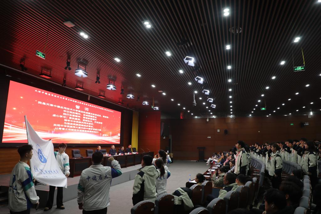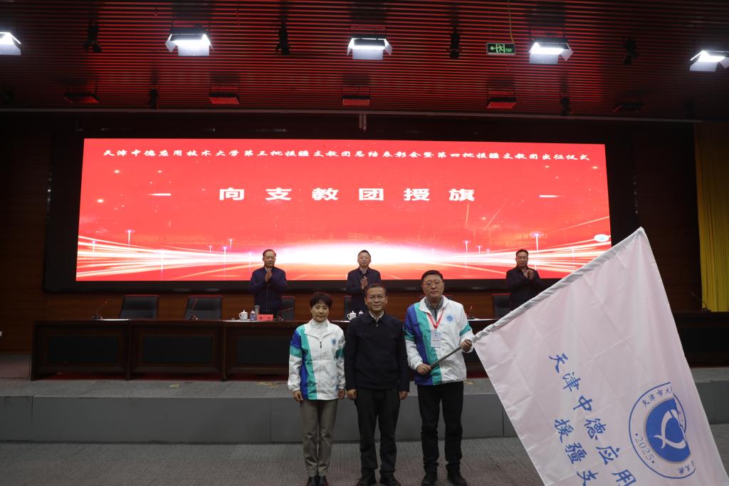 学校党委副书记、校长王海龙为第四批援疆支教团授旗。旗帜飘扬,象征着使命与荣耀。支教团全体师生庄严宣誓,誓言铿锵有力,彰显了坚定的决心与信念。
