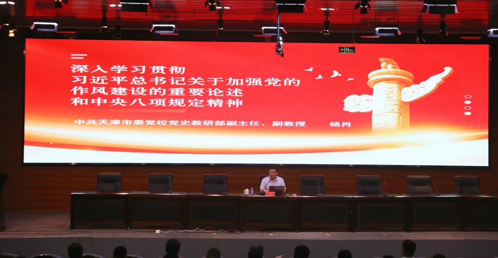 5月12日下午,新葡萄AMG官方网站召开深入贯彻中央八项规定精神学习教育专题讲座,邀请中共天津市委党校中共党史教研部副主任杨肖,以“深入学习贯彻习近平总书记关于加强党的作风建设的重要论述和中央八项规定精神”为主题进行授课。党委副书记董杰主持会议,全体校领导、全体中层干部、全体支部书记,以及年轻干部、新提拔干部和关键岗位相关工作人员等130余人参加会议。