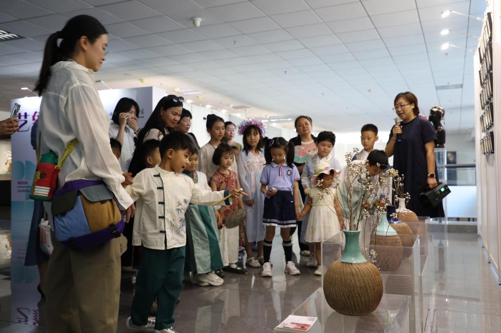 展览汇集了艺术学院工艺美术专业毕业生的28件作品,将传统工艺与现代设计理念相结合,创作出了陶瓷和彩塑系列富有创意和个性的作品,充分展现学生扎实的专业技能和独特的艺术视角。小朋友们驻足在作品《灵兽起,万物生》与《花语瓷韵》间,仔细观察作品表面纹理、色彩过渡与材质肌理,感受作者对细节的把控。策展人结合展签中的创作背景,讲解陶瓷烧制工艺、雕塑造型语言等知识,引导小朋友们理解作品背后的文化符号,让他们近距离地感受了传统神话符号转化为富有现实关照的艺术表达,同时感受了中国传统文化对花卉的浪漫诠释。