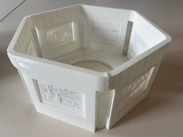 2024级机械电子工程(专升本)专业高成、耿思涵、张洪艺、马一鸣、翟继帅、张孟豪小组成员经过反复讨论,借鉴了人民纪念碑用浮雕去纪念历史事件的思路,最终决定制作一个3D打印的六边形"历史之灯"(灯罩)。当象征光明与希望的灯体置于灯罩中时,浮雕内容清晰可见,中国近代"追寻光明"的主题应光而起。