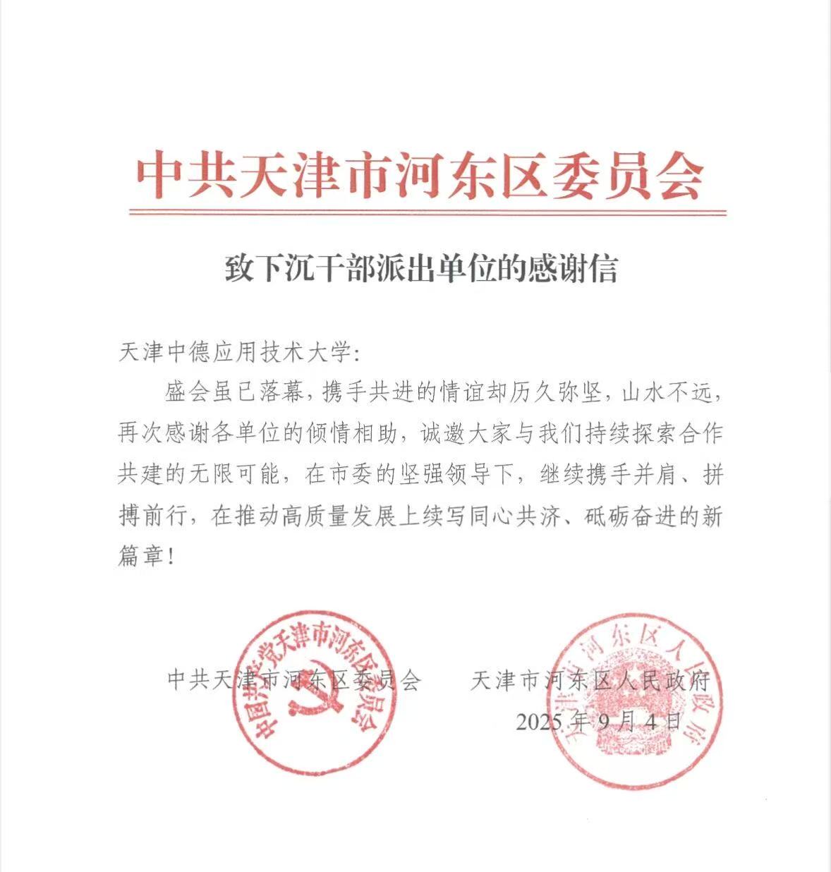 (中共天津市河东区委员会感谢信部分内容)