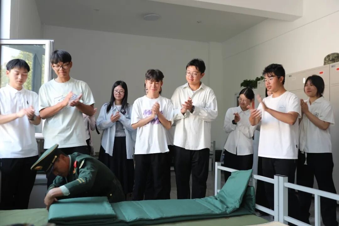 仪式结束后,在官兵的引导下,学生们走进军营。从“豆腐块”般整齐的营房宿舍,到配备专业器材的训练场地,官兵们严谨的日常作风、昂扬的精神风貌直观展现了人民军队的优良传统。参观过程中,学生们围着官兵好奇提问“被子怎么叠得这么整齐”“训练累不累”,中德学子则结合自身认知,向小学生们补充讲解国防建设的重要意义。这种“大带小、共体验”的模式,让小学生对军人职责有了具象认知,也让中德学子在分享中深化了对国防事业的崇敬,实现了不同学段学生的认知互补与情感共鸣。