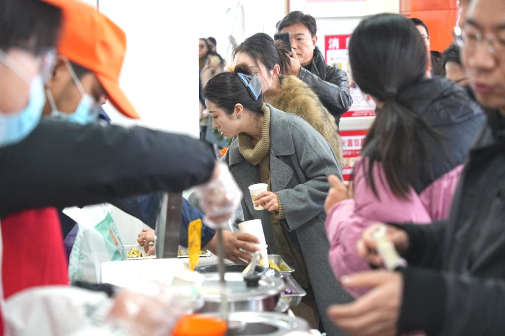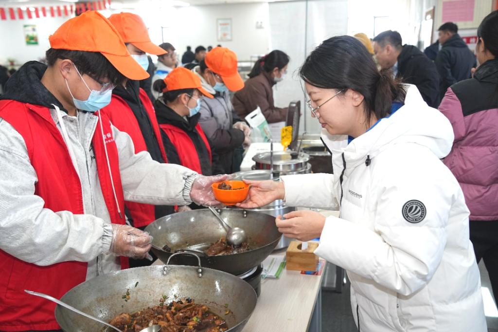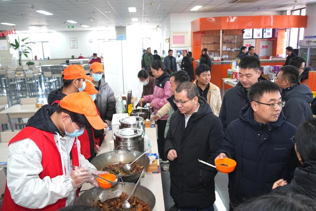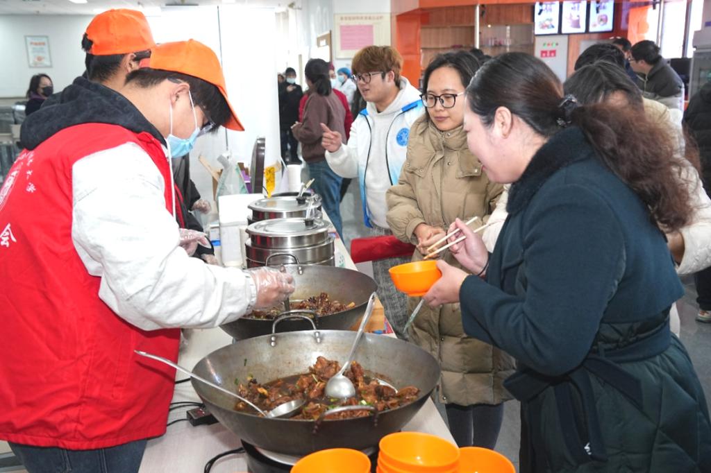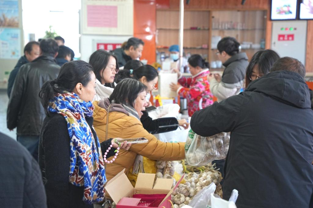 上午11:30,东棘坨镇特色农产品展销大集在学校教职工食堂三楼开市。展区精心布置了革命老区特色农产品,包括红瑶红薯、水果萝卜、大葱、大蒜、蟹田稻米等,品类丰富。品尝区内,现场烹制的红薯、水果萝卜、炸金蝉、炖柴鸡等绿色美食吸引了众多教职工驻足。家庭农场主和农户详细介绍了农产品的种植、培育、无公害处理及加工流程;志愿者有序引导教职工品尝选购,多款农产品迅速售罄。广大教职工表示,将通过线上预订和线下组织“中德大集”等形式,持续参与消费帮扶。