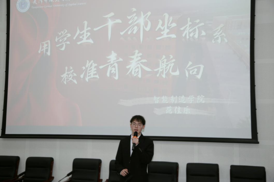 智能制造学院范佳乐同学,2023-2024学年国家励志奖学金、“十佳志愿者”获得者,以“用学生干部坐标系校准青春航向”为主题,分享了他担任学生干部的成长历程。通过讲述志愿服务、活动组织策划中的酸甜苦辣,鼓励同学们,在人生每一段旅途中,都要勇敢地去尝试,去挑战,去寻找属于自己的独特的人生坐标,让青春的航向更加清晰,更加坚定。