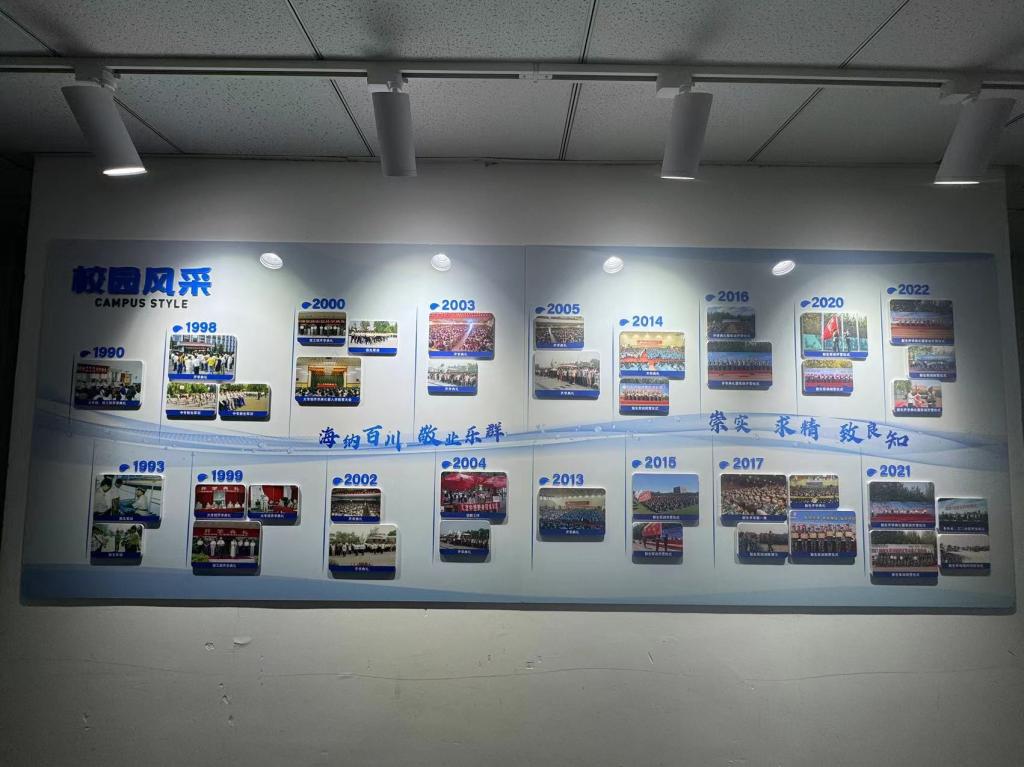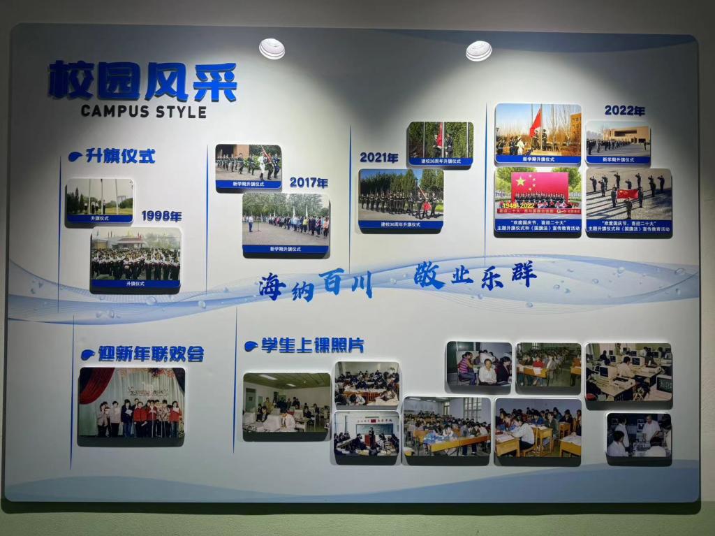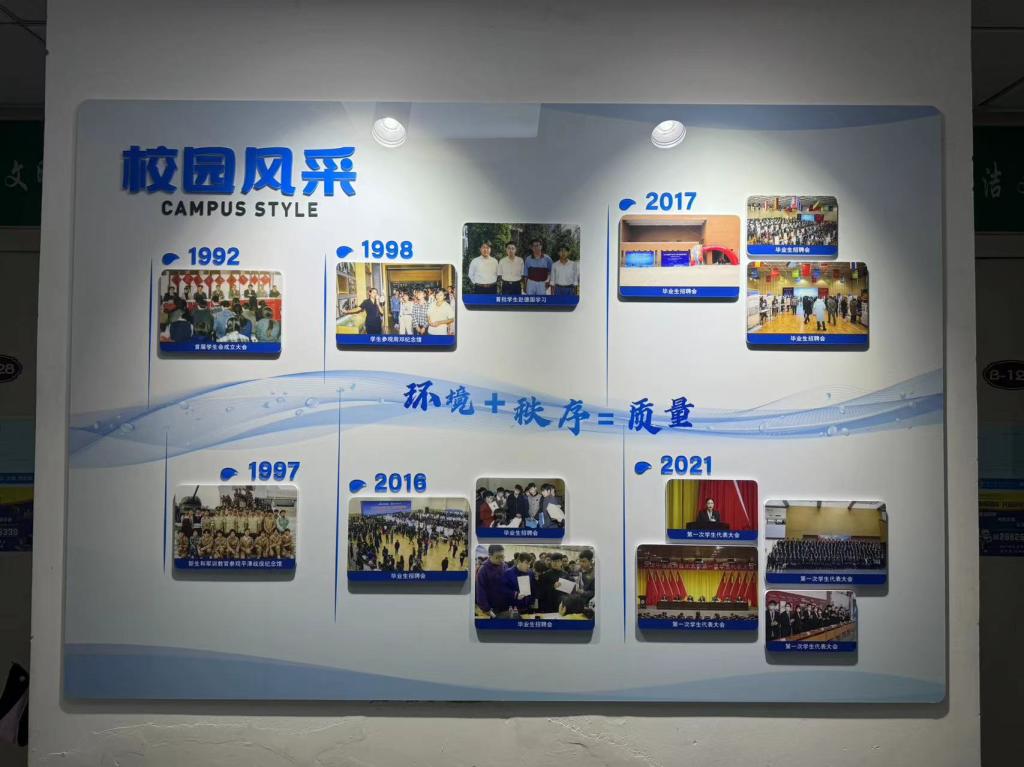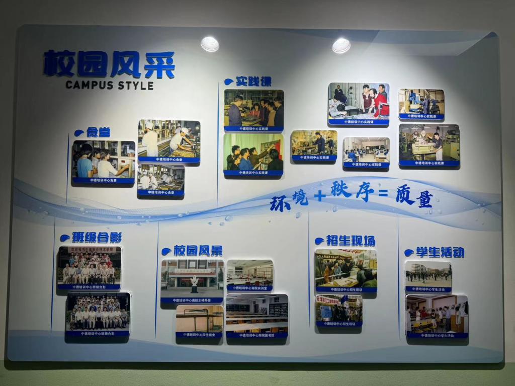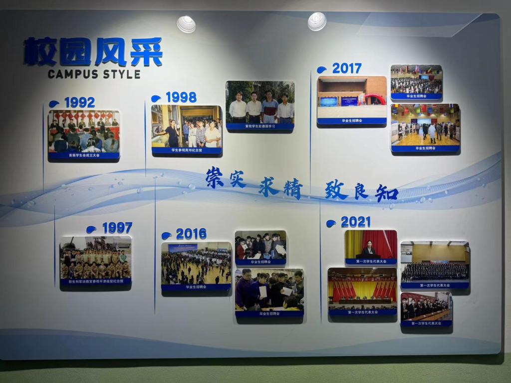 2023-2024学年第二学期开学初,党委学生工作部(学生处、人民武装部)在学校档案系统中挑选出具有代表性的图文资料,结合中德精神和学生的兴趣点,归纳设计出“校友展示”、“校园风采”和“学生活动”三大模块,并按照年份顺序进行排列,以“灵动的海河水”进行串联,“海河”上印有中德校训、中德精神或“环境+秩序=质量”的标语,最终形成15面中德文化墙。