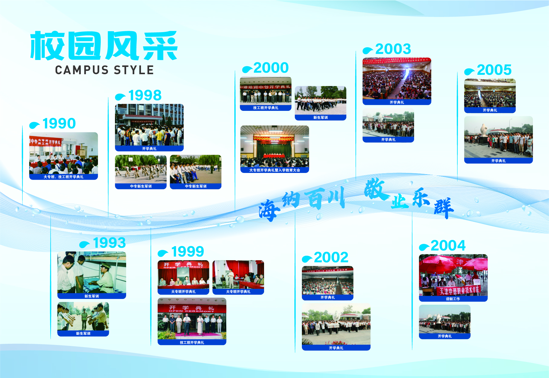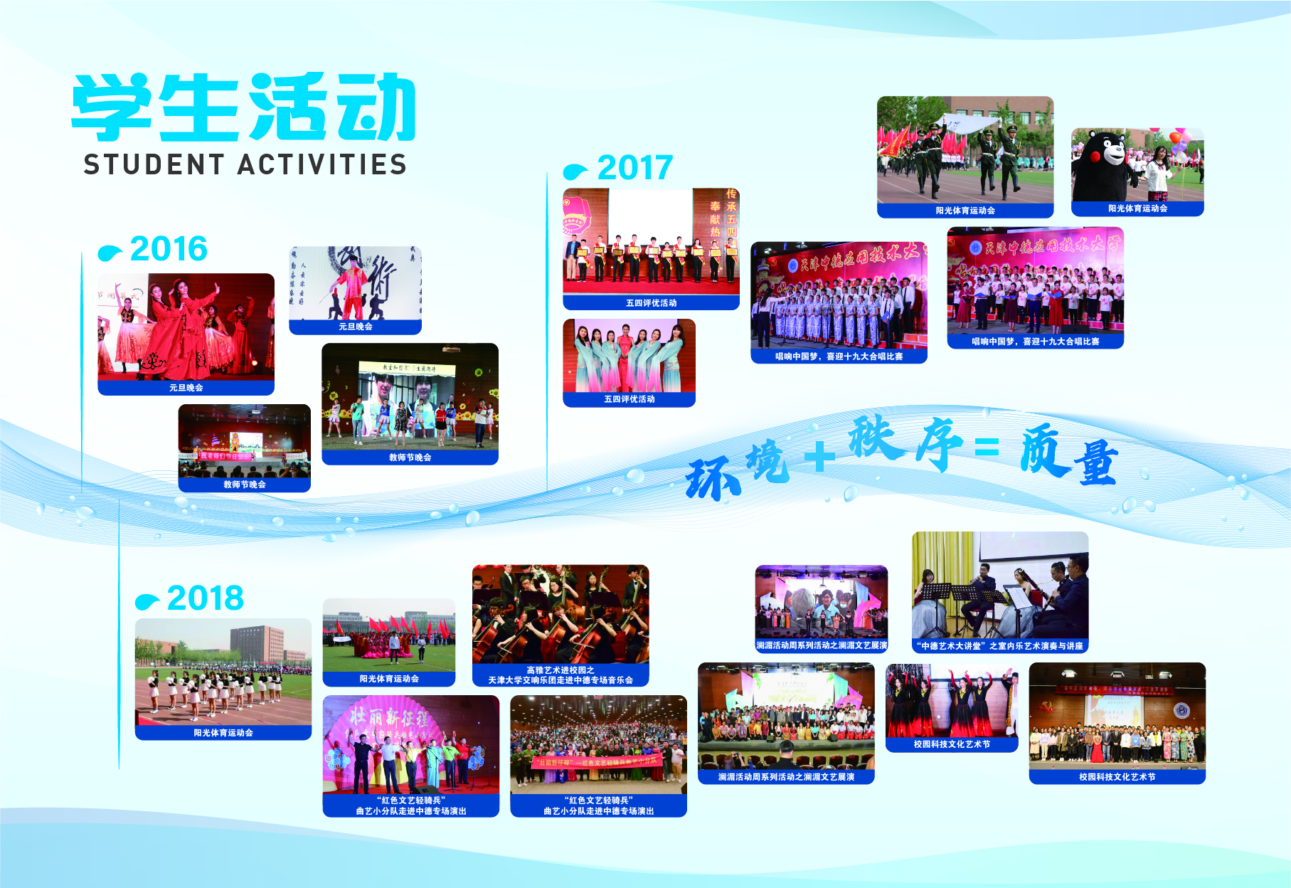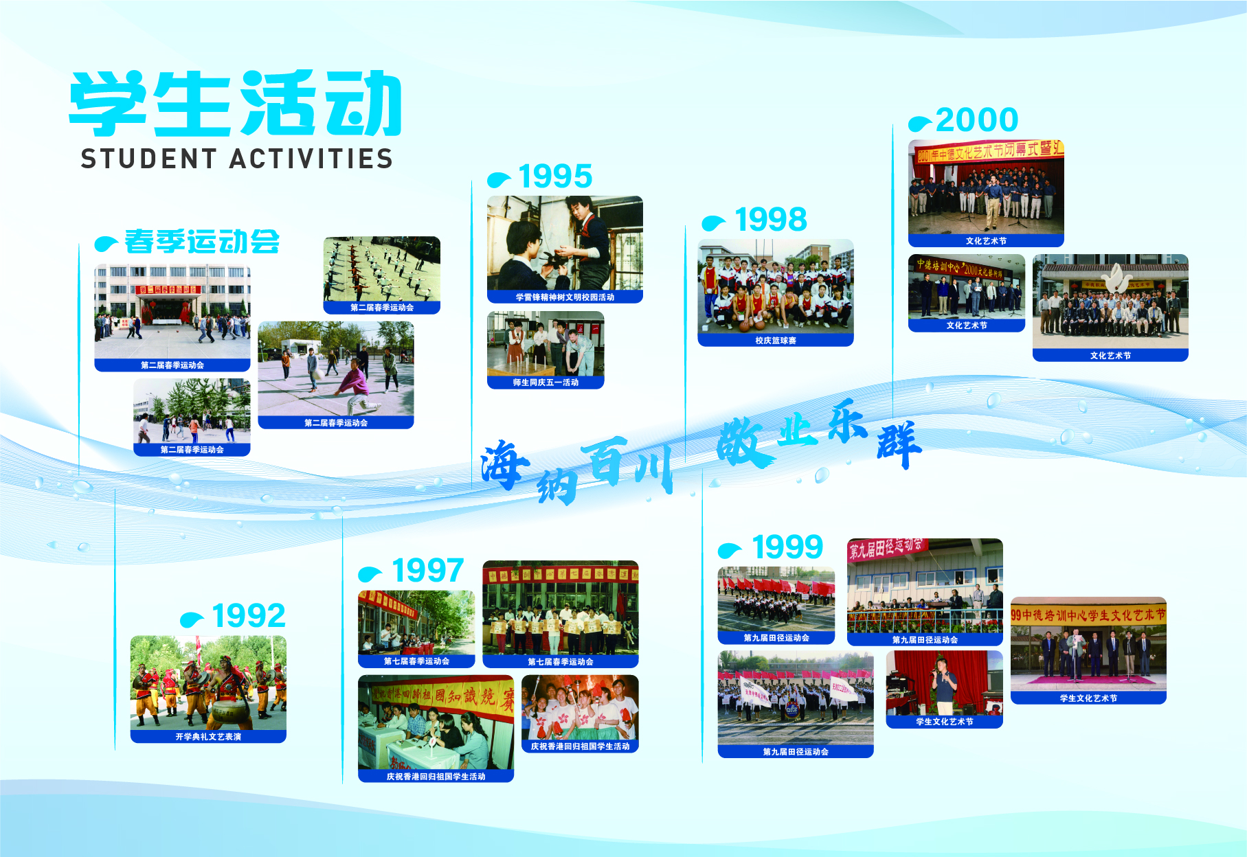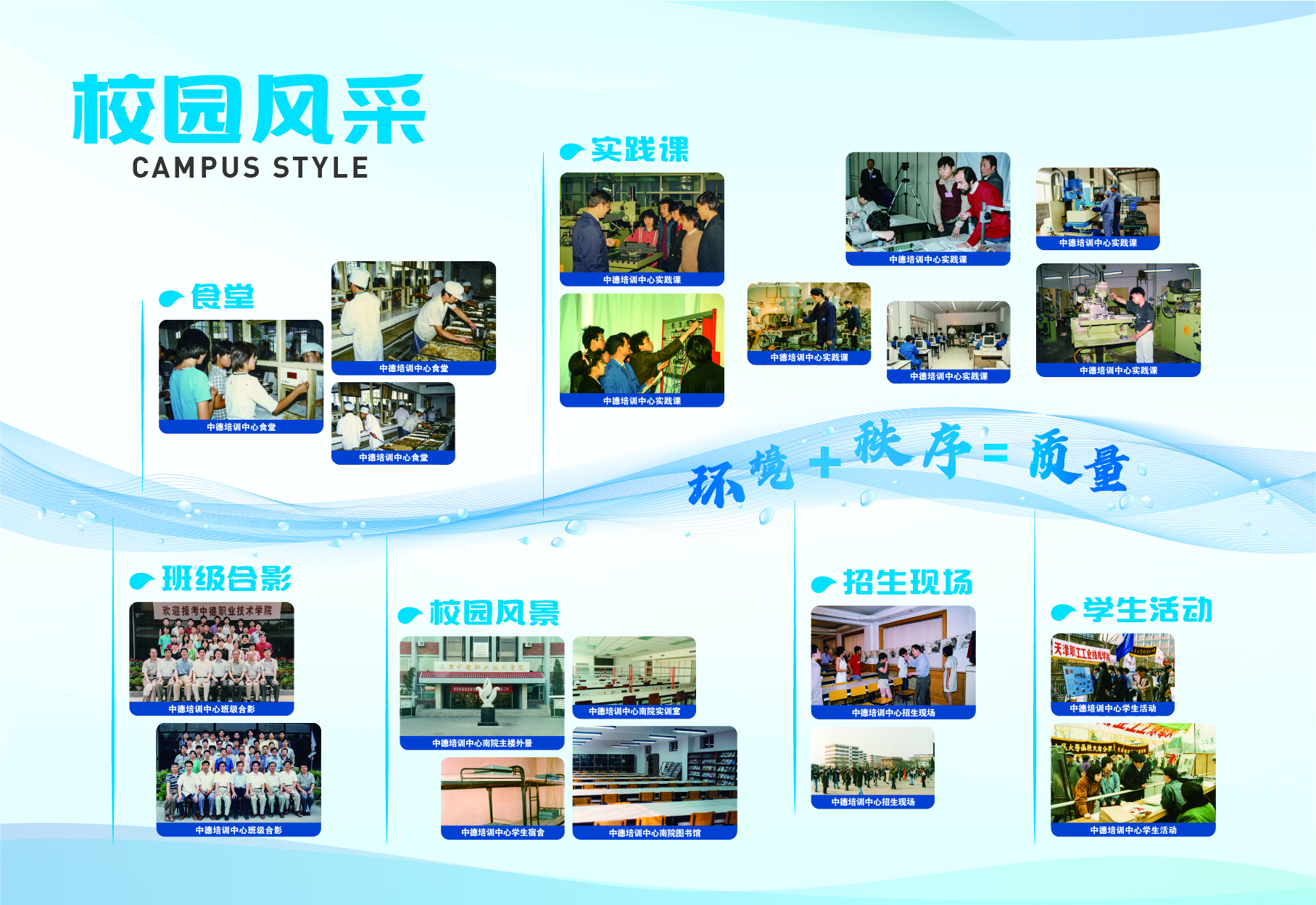 2023-2024学年第二学期开学初,党委学生工作部(学生处、人民武装部)在学校档案系统中挑选出具有代表性的图文资料,结合中德精神和学生的兴趣点,归纳设计出“校友展示”、“校园风采”和“学生活动”三大模块,并按照年份顺序进行排列,以“灵动的海河水”进行串联,“海河”上印有中德校训、中德精神或“环境+秩序=质量”的标语,最终形成15面中德文化墙。