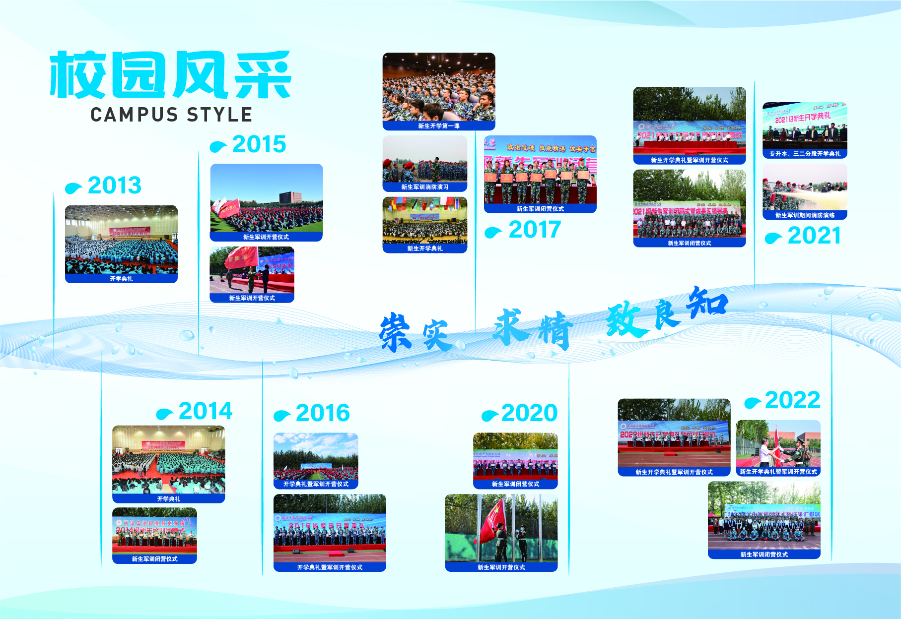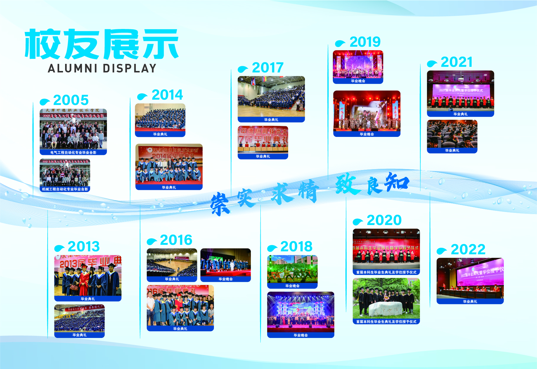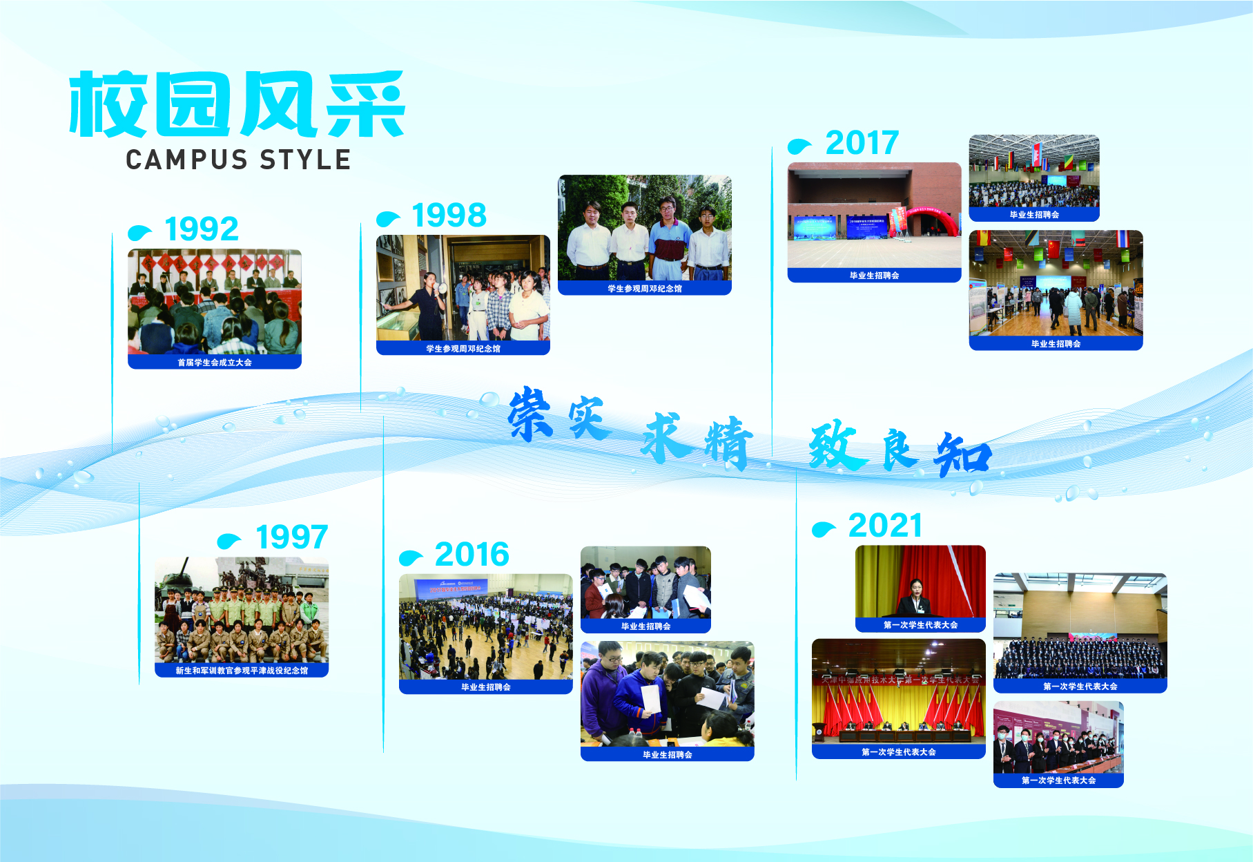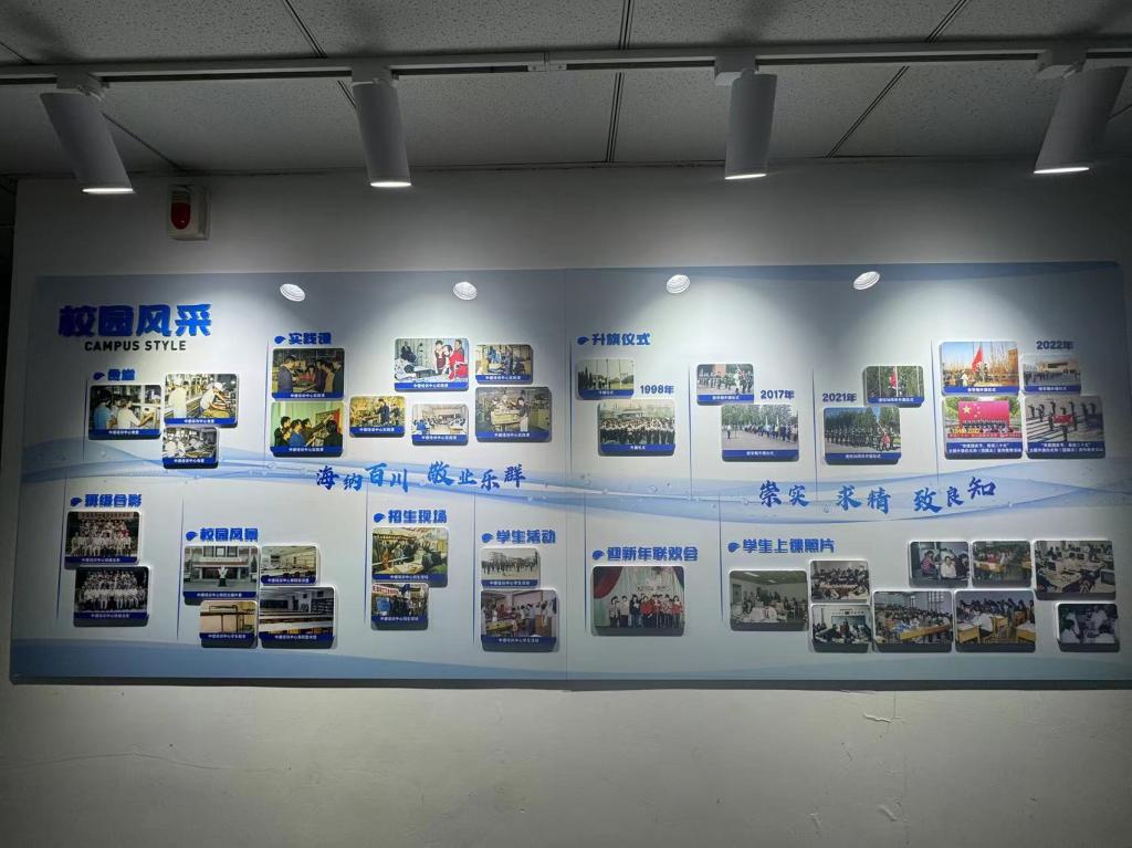 2023-2024学年第二学期开学初,党委学生工作部(学生处、人民武装部)在学校档案系统中挑选出具有代表性的图文资料,结合中德精神和学生的兴趣点,归纳设计出“校友展示”、“校园风采”和“学生活动”三大模块,并按照年份顺序进行排列,以“灵动的海河水”进行串联,“海河”上印有中德校训、中德精神或“环境+秩序=质量”的标语,最终形成15面中德文化墙。